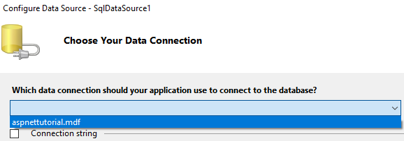 Now, we are going to configure the newly created SQL Data Source to the database (aspnettutorial.mdf) which we have created in the previous tutorial.