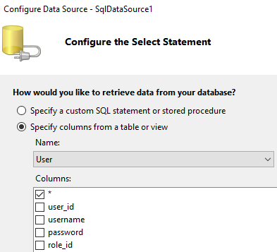 Next, we are going to configure the table which we are going to retrieve our data. Since it is a Login page, and we will need to use the users’ data, so we will choose User as our table. Check the (*) box, which indicates that we are going to select/query all columns from the User table. Click Next.