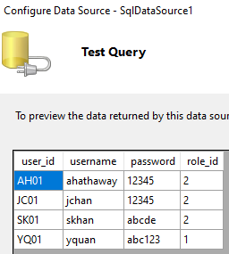Finally, lets test the query by clicking on the Test Query button. We are supposed the see all the data from our User table. Click Finish.