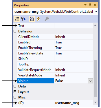 <asp:TextBox ID="username_txtbox" runat="server"></asp:TextBox> <asp:Label ID="username_msg" Visible="false" runat="server" Text=""></asp:Label>For the second method, we just need to click on the label in Design mode and update the properties through the Properties window: